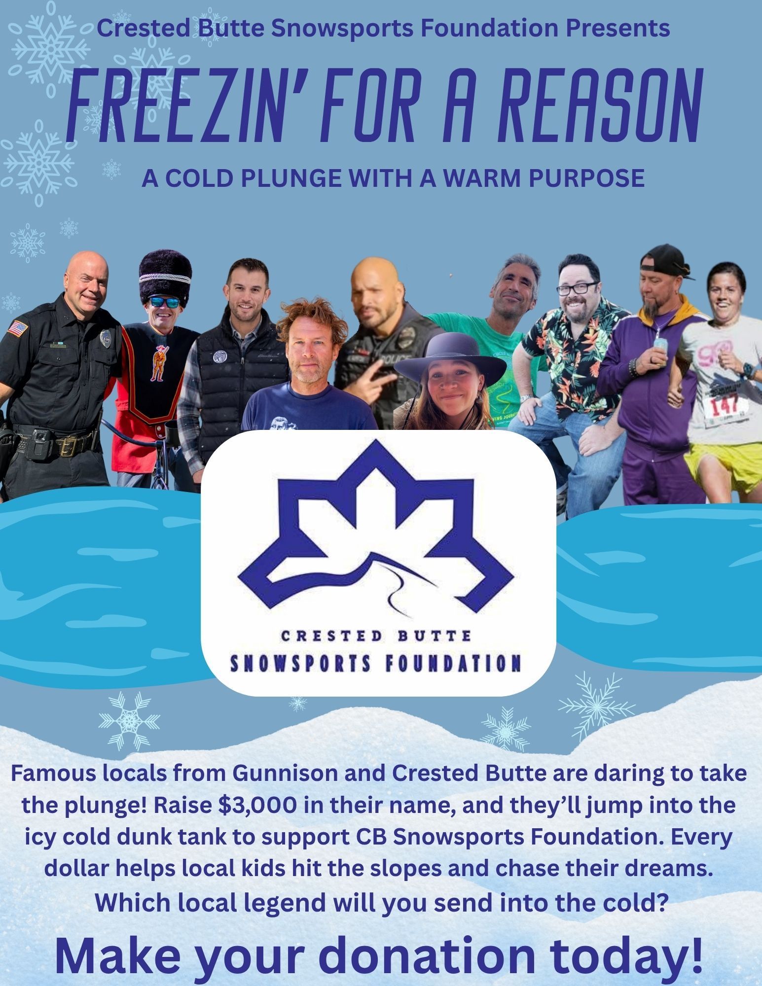 Once $3,000 is raised in their name, they’ll take an icy dip—all to support the Crested Butte Snowsports Foundation. Every dollar raised helps local kids access the slopes, stay in the sport, and chase their snow-filled dreams.